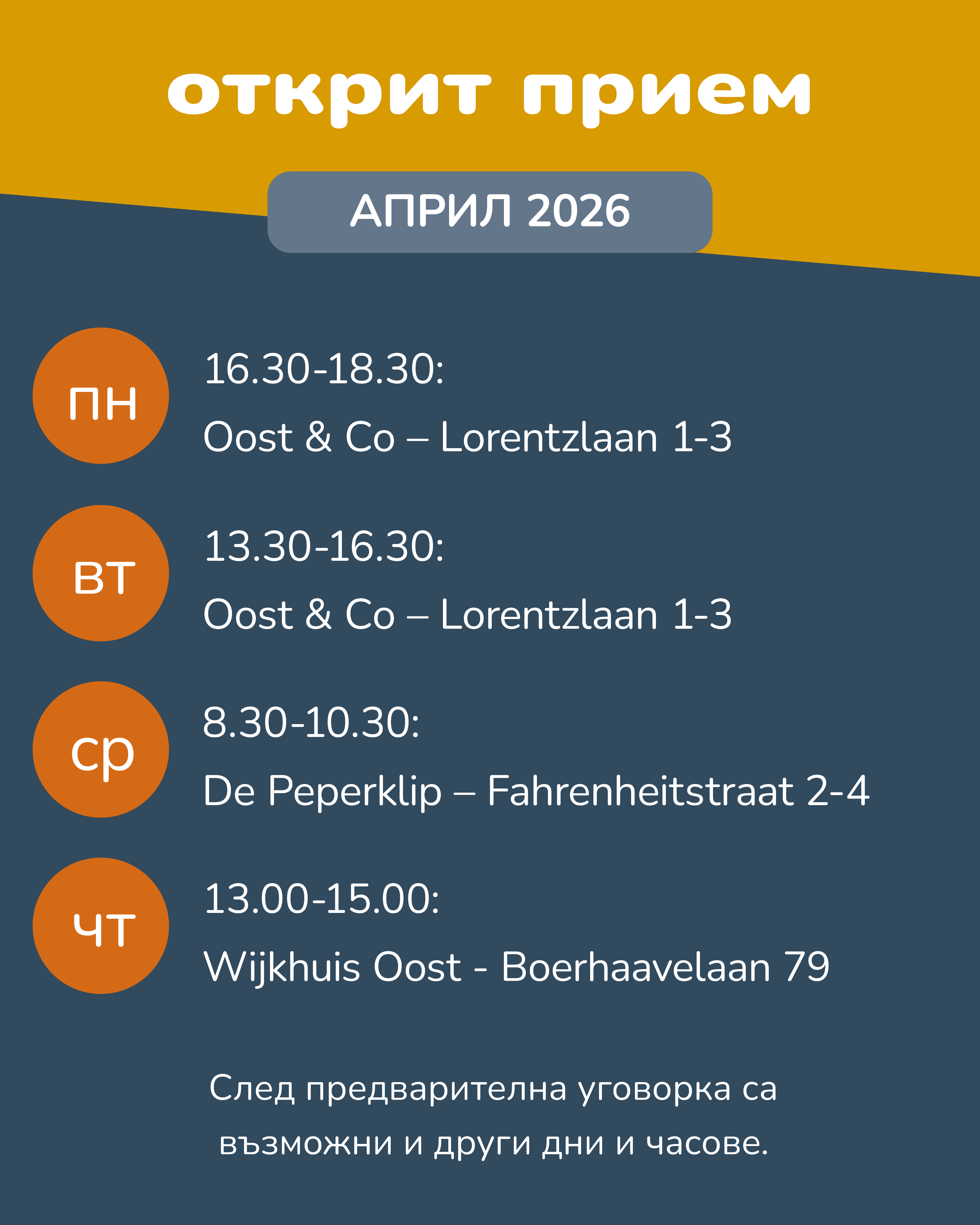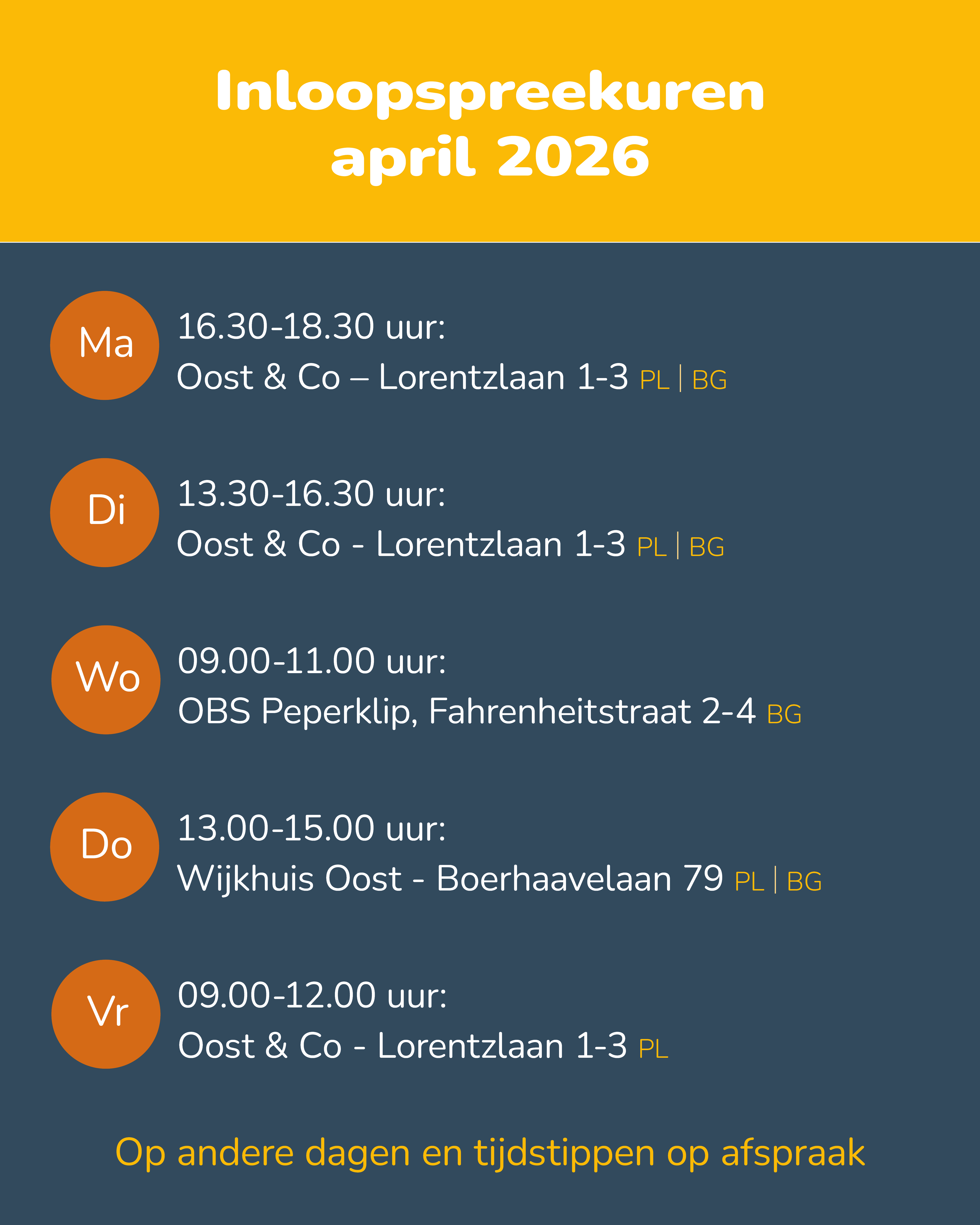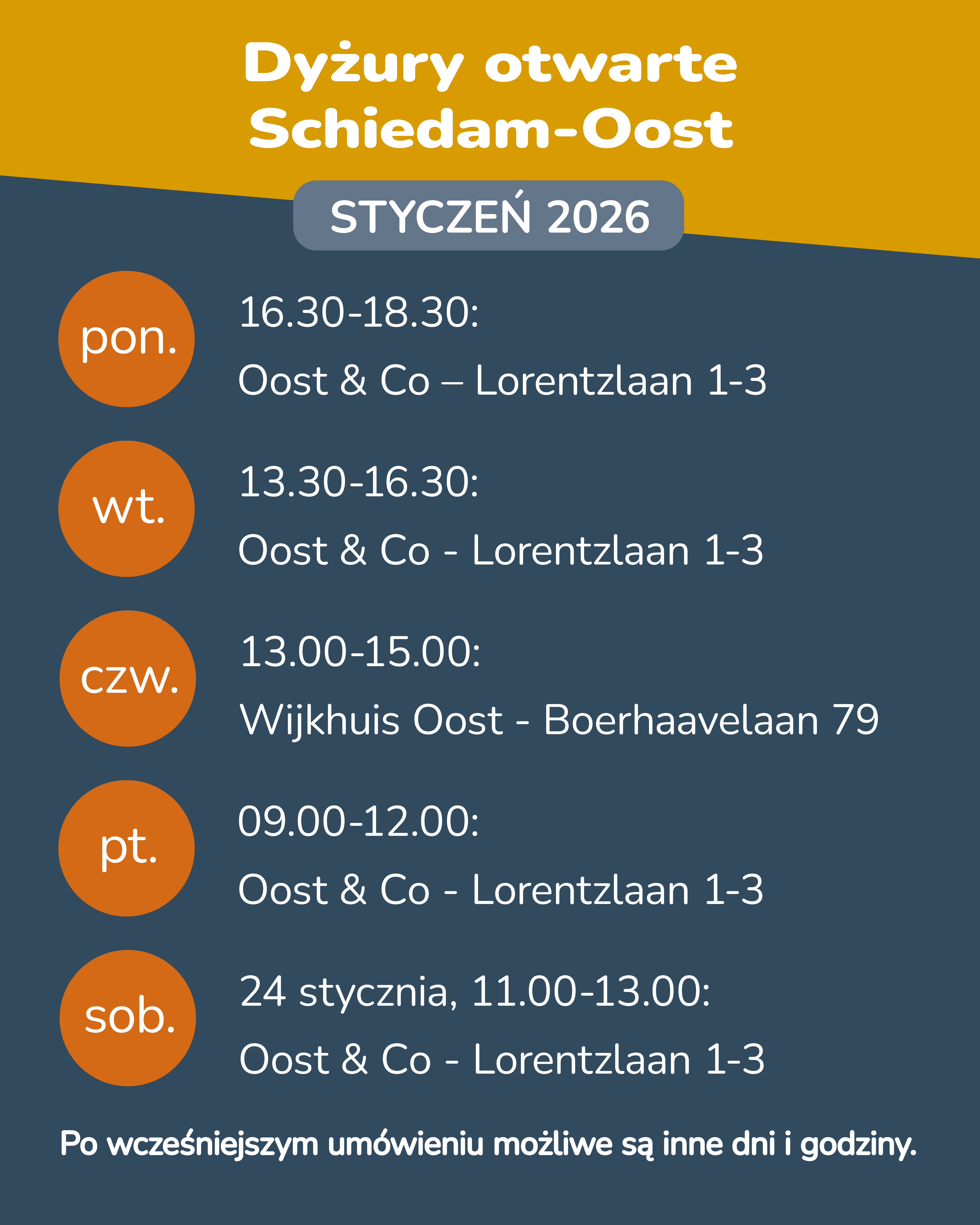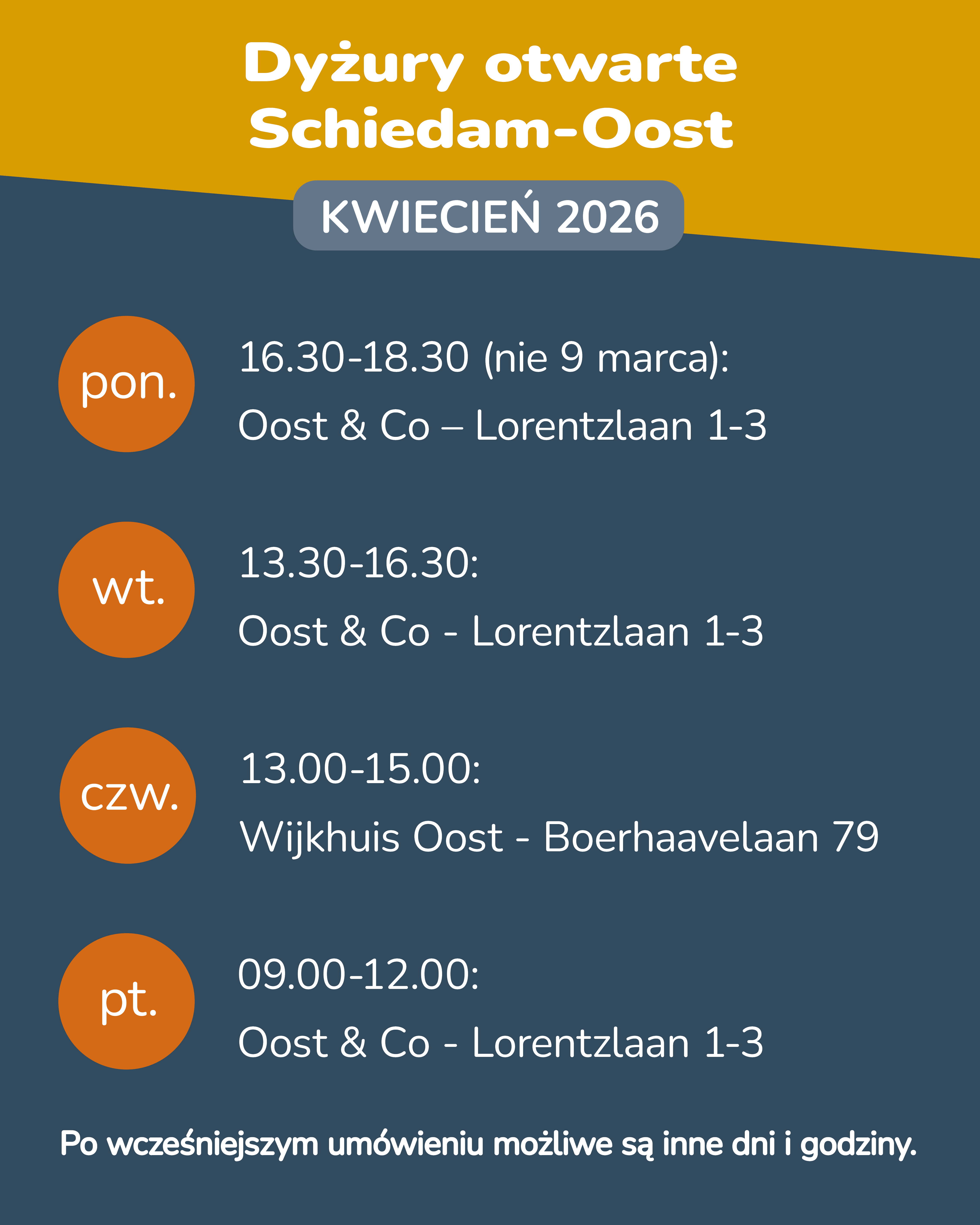 Wegwijs in Oost is een mobiel informatiepunt voor Poolse en Bulgaarse bewoners van Schiedam-Oost. Ervaringsdeskundige sleutelpersonen uit beide gemeenschappen ondersteunen hun landgenoten — in hun eigen taal — bij het wegwijs worden in de Nederlandse samenleving. Ze geven informatie en advies over wonen, werken en meedoen, verwijzen waar nodig door naar instanties en brengen mensen in verbinding met het informele wijknetwerk. Gratis, zonder afspraak en volledig vertrouwelijk.