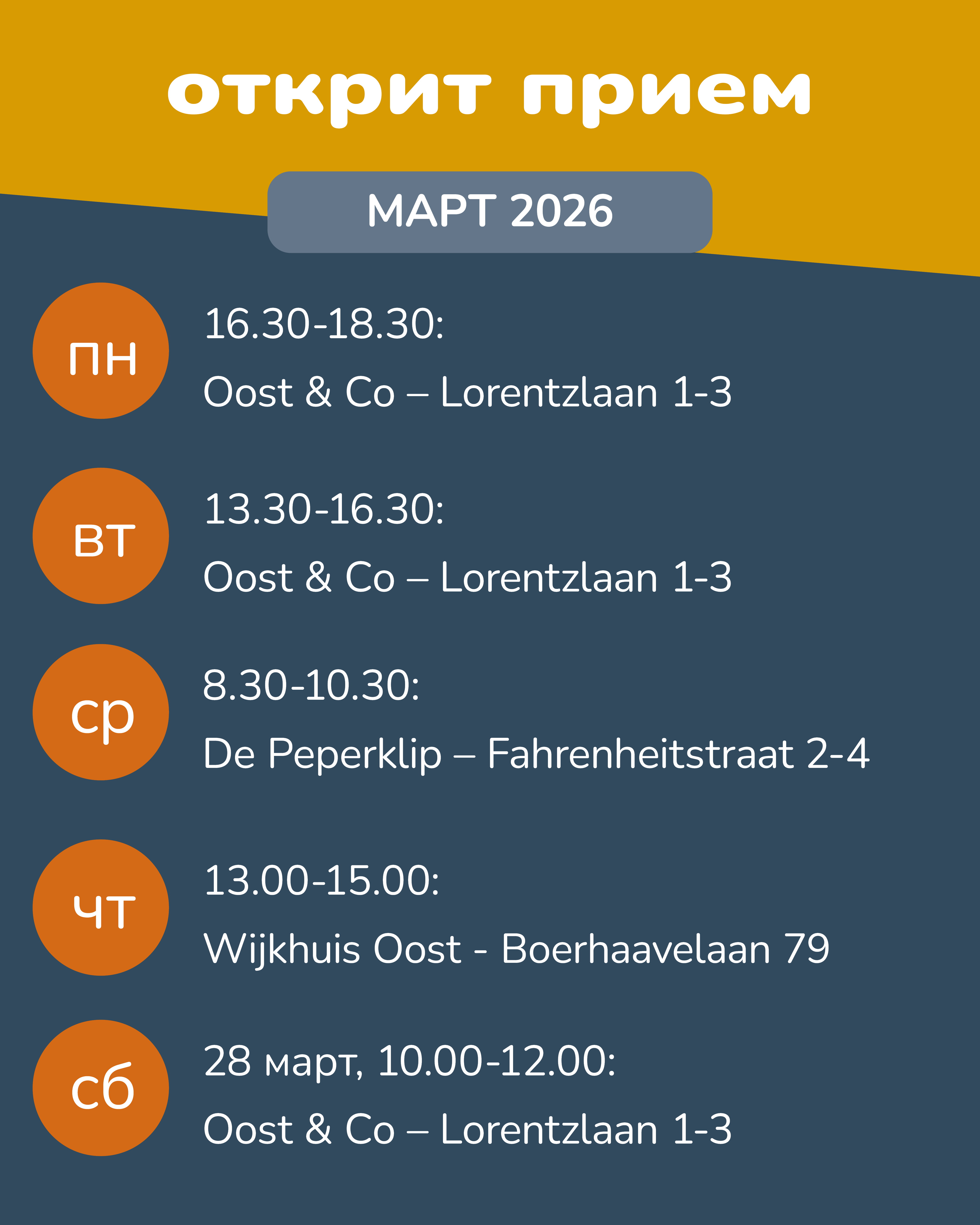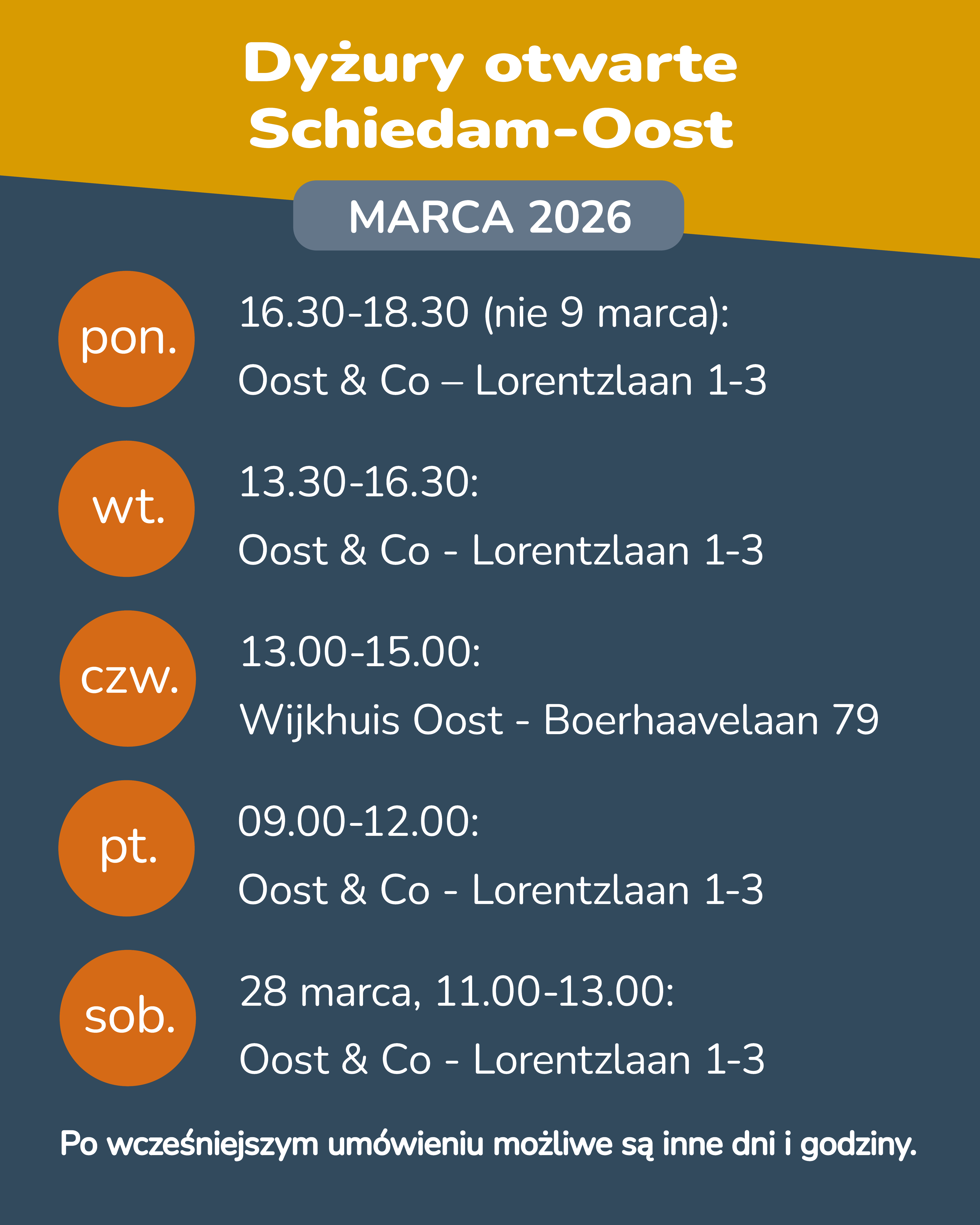 Wegwijs in Oost to mobilny punkt informacyjny dla migrantów zarobkowych w dzielnicy Schiedam-Oost. Doradcy Polskiego i  Bułgarskiego pochodzenia będą odwiedzać naszą dzielnicę, aby pomagać swoim rodakom – w ich ojczystym języku – odnaleźć się w życiu i pracy w Holandii, a szczególnie w Schiedam-Oost.